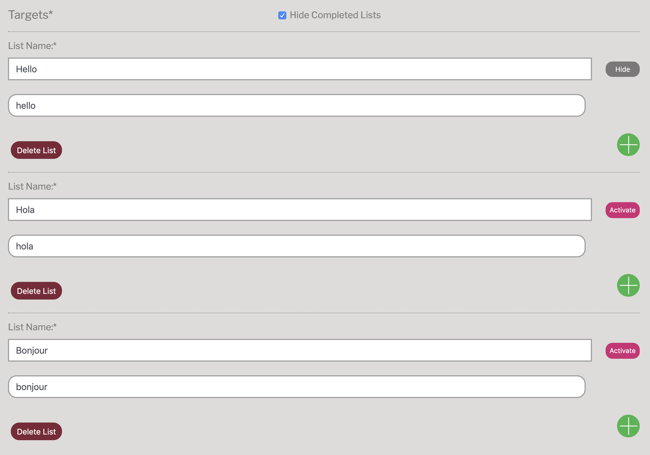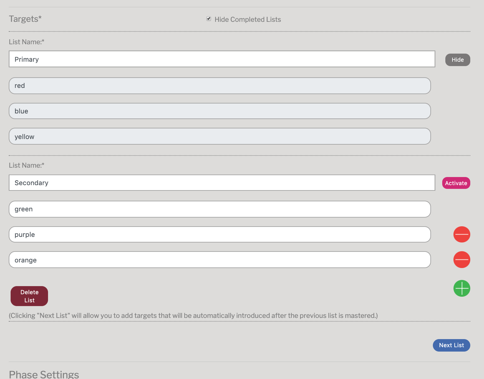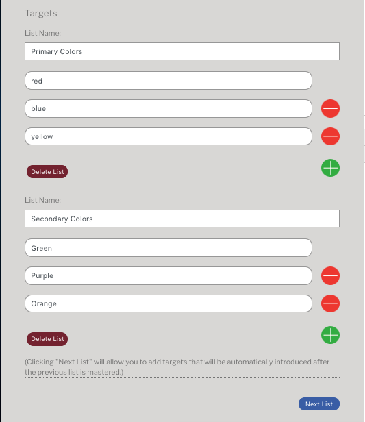 If you'd like to teach 1 target or list at a time, then hit the Next List button and add your next target in the new list. Upon creating a new list, you'll find that each list will have a List Name field. This is a required field, even for single target lists.
