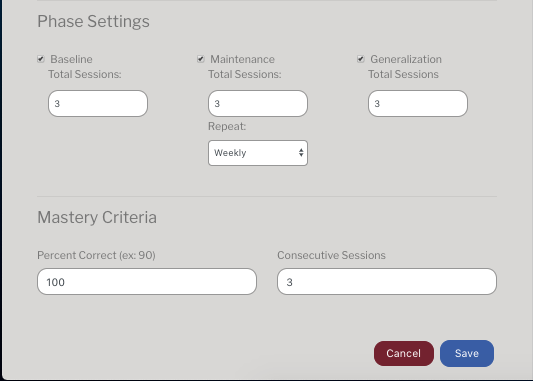 Mastery Criteria requires you to indicate how many consecutive sessions the client must get the indicated Percent Correct in order to move on to the next target, list, or phase.